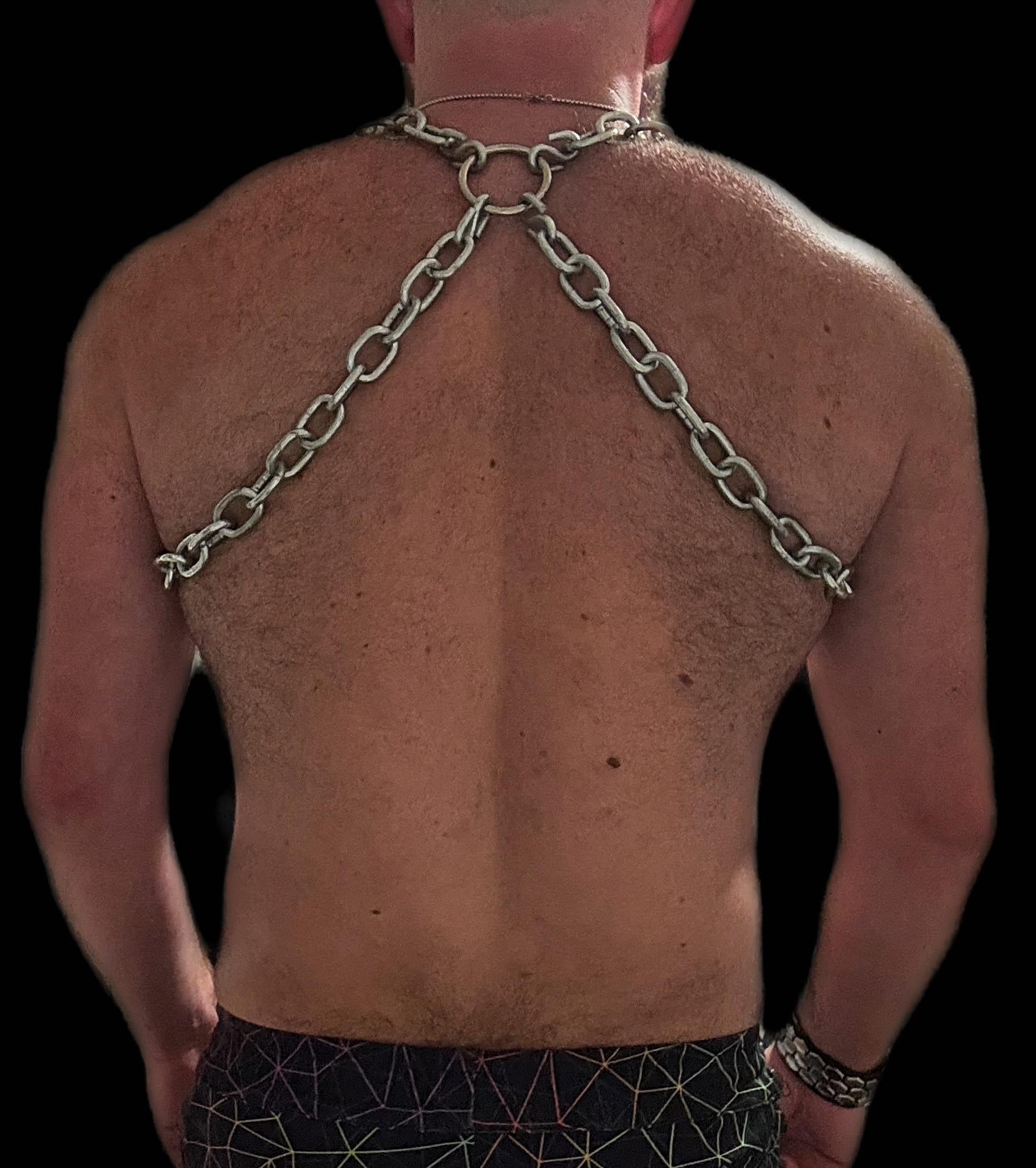 This stunning, handcrafted chain harness is built from chains, seamlessly connected with durable O-ring clips. Designed to make you stand out, it features our four adjustable turnbuckles at the back, offering about 2 inches of flexibility for the perfect fit. Pair it with a Jockstrap and other bold add-ons to complete your look.