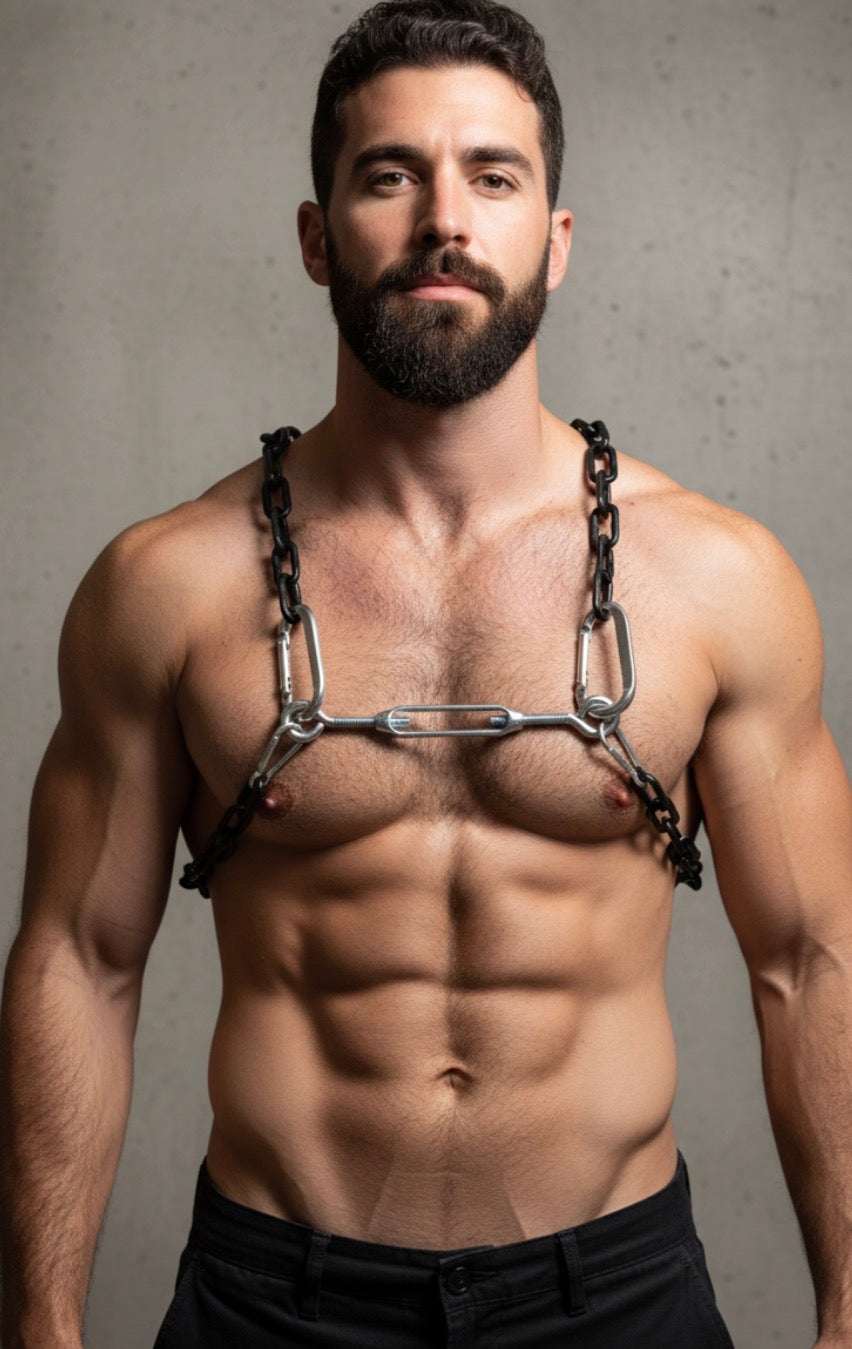 This stunning, handcrafted chain harness is built from plastic chains, seamlessly connected with durable O-ring clips. Designed to make you stand out, it features our four adjustable turnbuckles at the back, offering about 2 inches of flexibility for the perfect fit. Pair it with a Jockstrap and other bold add-ons to complete your look.